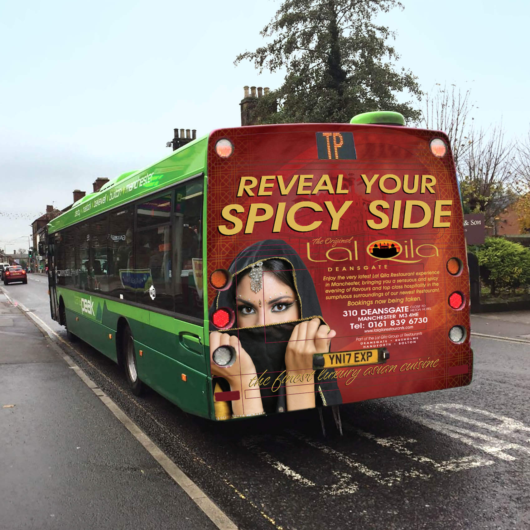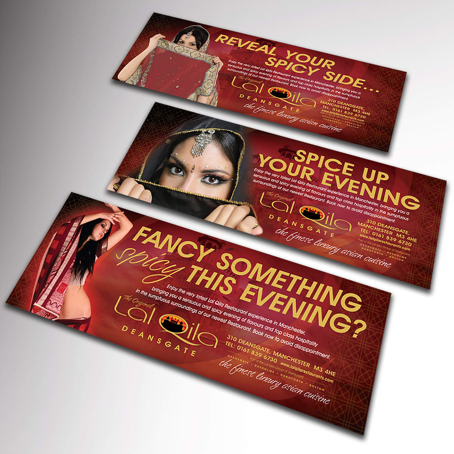 As well as the new branding, a comprehensive advertising campaign was commissioned for Lal Qila Manchester, looking at bus and tram advertising, a series of 4-sheet poster sites across the city, leafleting, and newspaper and magazine advertising leading up to the opening.